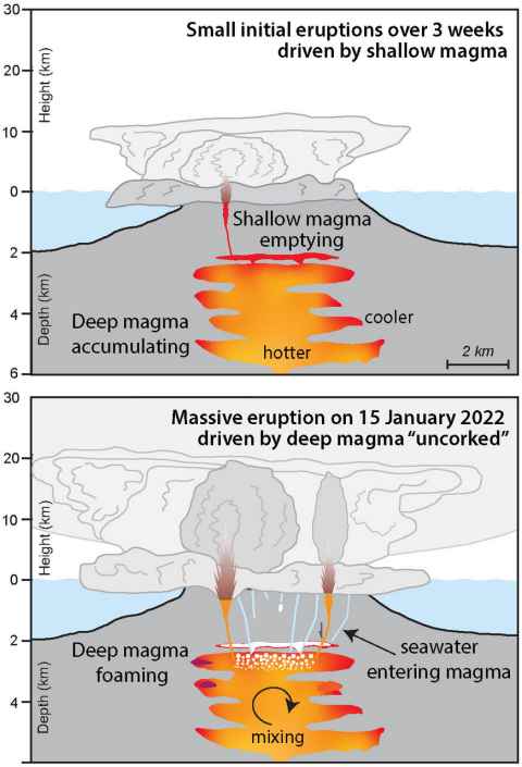 In the weeks before the main blast on 15 January, smaller eruptions came from a shallow upper magma layer, says Professor Shane Cronin of the School of Environment at Waipapa Taumata Rau, University of Auckland.